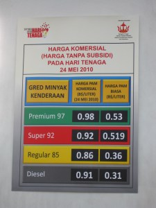 I heard about this from someone during lunch, they said they read it in the news. I was not so sure, cuz I must have missed the news so I didn’t read about it myself. But on Saturday, 22nd May 2010, I was buying fuel for my car and saw the sign on the side of the fuel pumps. The prices of fuel in Brunei will have no subsidy on monday 24th of May 2010.