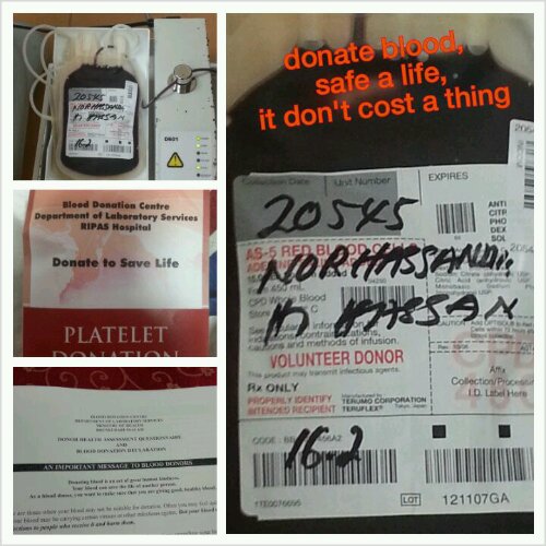 My sister is proud to show off that she is fit enough to give blood. She usually has a low blood count that she is sometimes not allowed. This time she had more blood count then previous. She credits it to her new recent slow carbon diet, as well as her hiking since new years. Her blood count is higher in spite of her weight being down from last year. The blood department is always requesting for more blood donations. The demand for it is high, while the supply is often low. The demand is due to operations, accidents as well as health conditions that require blood transfusion. If you want to donate blood, go to the hospital (during office hours is best) and donate. In order to donate blood you need to fulfill certain criteria. Basically you should be fit. Here is the list. 1. At least 55 kg. 2. Must not be sick recently. In the last 2 weeks. 3. Must not be taking medication. Not even panadol on that day. supplements do not count. 4. For women, not during their menstrual period or if their pregnant. Before you donate blood you will be given a check if you are fit to donate blood. First is a form that asks you a lot of questions regarding your health. Then a fitness check. Checking your blood pressure and heart rate. Then off to getting your blood. You have the option of getting local anesthetic. (i challenge you to try it without). then they take less then litre of your blood. The best part for me is they usually have food and giveaways. For more information check out the blood donation fb and twitter.