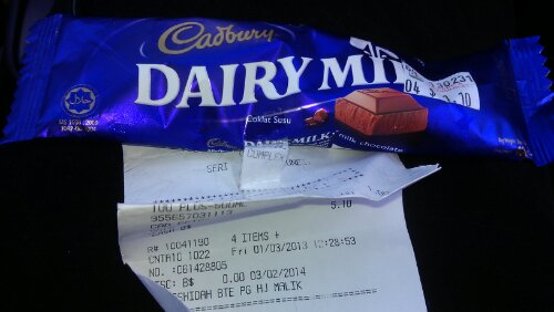 This morning after my run, I stumbled upon an unopened chocolate bar at the parking lot next to padang balapan. There was a receipt attached to it stating it was purhased yesterday. It was a bit mushy, but I decided to take it. Thank you whoever lost it. Allow me to eat what you had originally intended to eat, lest we allow it to go to waste.