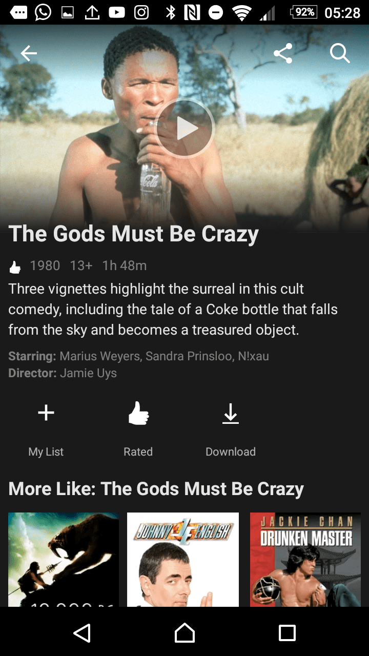 Late night watched “Gods Must be Crazy” on Netflix. My wife and I separately remembered watching as kids. My wife remembered watching it but didn’t understand the humor then. I just remembered that it was ridiculous.
